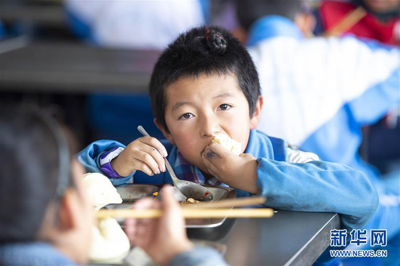 在西吉縣田坪鄉中心小學,學生在享用免費營養午餐(10月23日攝)。(新華社發 楊植森/攝)