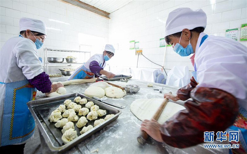 在西吉縣田坪鄉中心小學,食堂的工作人員在制作午餐面點(10月23日攝)。(新華社發 楊植森/攝)