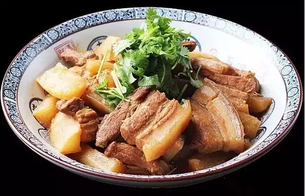 凈鍋里放油燒熱,下豬肉塊煸炒至吐油時,下八角、草果、良姜等香料一同炒,摻清水燒開再加鹽和醬油,燒至豬肉熟時,再把蘿卜塊加進去同燒至軟熟,待用。