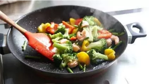 正確做法:每道素菜放油量不超過(guò)一湯匙,怕糊鍋可以用平底鍋炒菜,保證受熱均勻。
