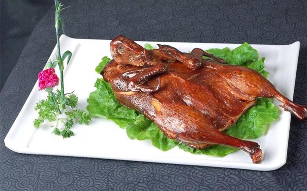 7、上桌前把“醬板鴨”剁成條塊,裝入盤中還原成鴨形,然后用紅油加鹵鴨原汁調(diào)勻成紅油鹵汁,淋在盤中鴨塊上,即成。
